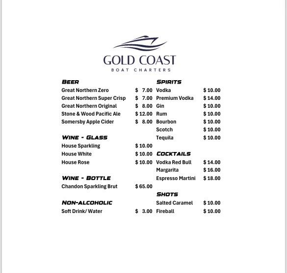- BYO catering available, alternatively we can arrange onboard catering.