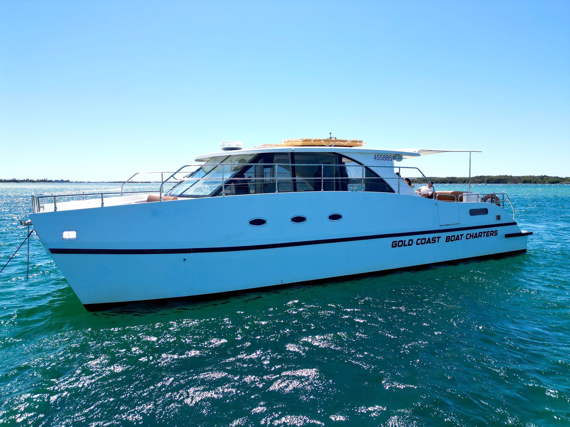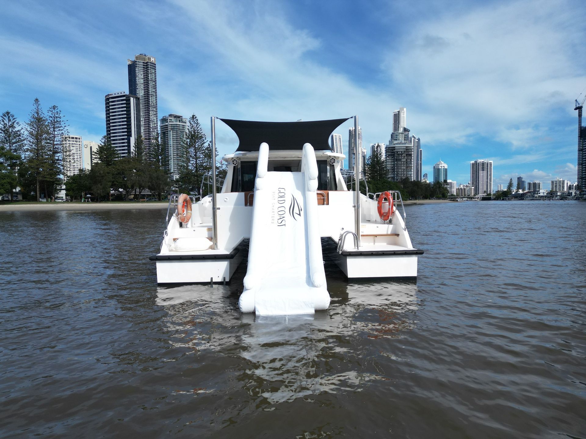 Step aboard this stunning 46' power catamaran, a vessel custom-built for VIP spectators at the America's Cup. Designed for both comfort and entertainment, this luxury charter accommodates up to 36 guests, offering an unforgettable experience on the breathtaking Gold Coast Broadwater. Enjoy a fully stocked onboard bar, a thrilling superyacht waterslide, and a fully air-conditioned cabin for absolute relaxation. The state-of-the-art sound system, complete with Bluetooth and DJ connection, sets the perfect vibe for any occasion. Whether you're planning a private celebration, corporate event, or just a spectacular day on the water, this exclusive charter delivers the ultimate in style and excitement.