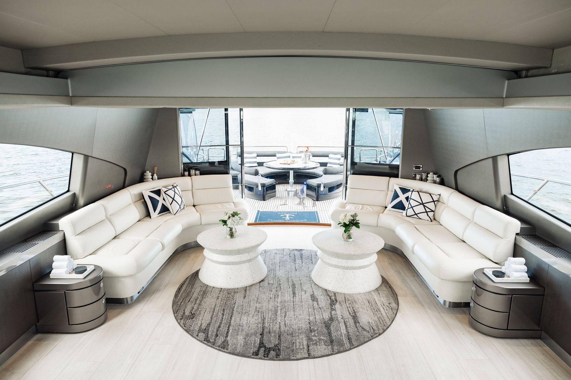 - Flybridge lounge area with seating for eight guests